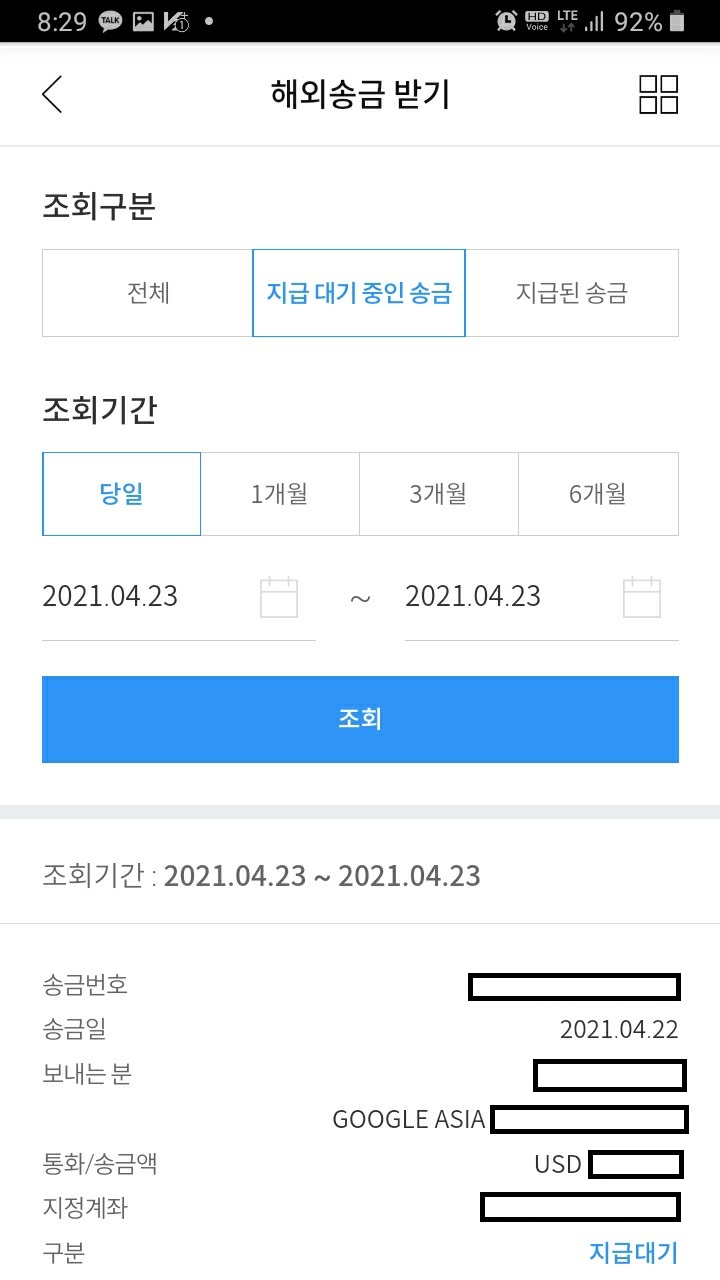문자 서비스를 신청하면 이제 21일 구글 지급메일이 오고 1일~2일 해외송금 획인요청 문자를 받으면 우리은행앱에 접속하여 위와 같이 확인하시고 신청하시면 즉시 통장에 입금됩니다.