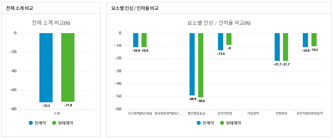 로그인을 하면 가입한 자동차보험사와 보험시작일 종료일이 나오고 전계약 내역과 현재계약에 대해 비교와 본인의 할인할증등급을 확인할 수 있습니다. 저같은 경우 19Z 등급으로 할인을 받았습니다. 올해는 전체적인 올랐다는 이야기를 들었는데 실제 작년에 비해 연령, 부부운전한정 등 기준으로 2.5% 작년에 비해 올랐네요.